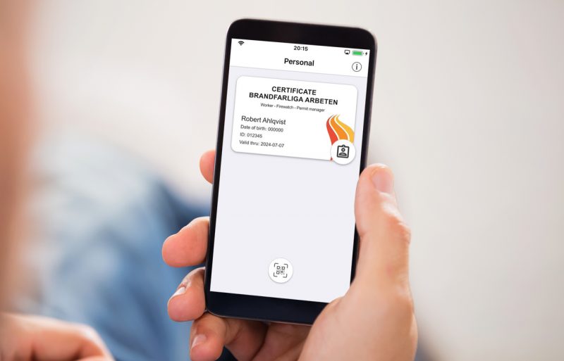 As soon as a card is ordered, the user can download a digital ID to the mobile phone. The digital ID includes a QR code that can be scanned to verify the certification. This way the user can make instant use of their new competence. The digital ID can be used on iOS and Android platforms and is protected by PIN or fingerprint, so that it cannot be misused.